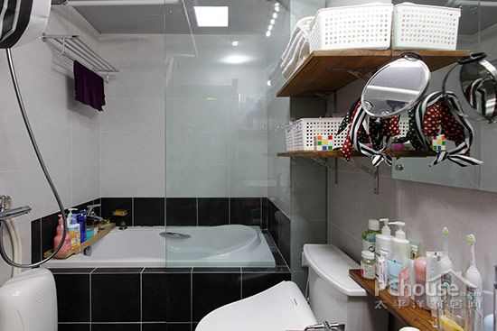 设计师点评:卫生间的空间相对狭小,巧妙的利用台盆到马桶之间的距离,延伸出一个置物空间,台盆地下的竹筐和马桶上方的隔板,为业主提供了充分的收纳空间。