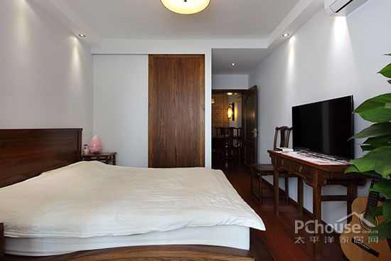 设计师点评:选择明式案几作为卧室的电视机柜,既透出古朴的韵味,又增加了走道的空间。步入式衣帽间的门同样选择了榆木的材质。