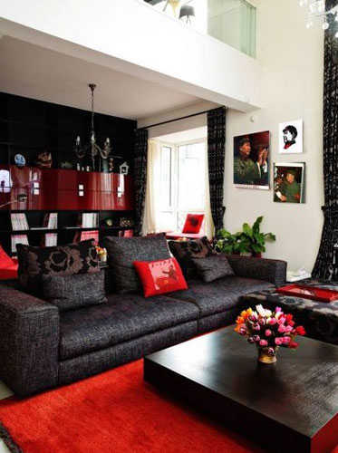 通透的落地窗配以通顶的黑色碎花布艺窗帘,与灰黑色的沙发交相映衬。阳光好的午后,可以和几个朋友在客厅外的竹椅聊天,喝一杯小酒。窗外的光线透过玻璃折射进诺大的客厅,红色的地毯增添了客厅的温度。红色的年代,美好的午后。