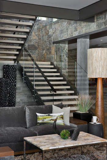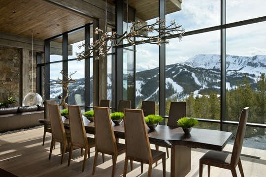 编辑点评:用透明玻璃窗代替厚重的墙壁,既能提高采光率,还能开阔视野,将室外的美景映入眼帘。而树枝图案的吊灯设计,则与窗外的大自然风光,室内大量的原木设计相融合,增添空间的和谐自然美。