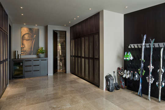编辑点评:设计师在墙壁上安置挂钩,挂置雪橇等体育用具,这一设计既节省空间,又无形中为空间增添收纳能力,而用墙壁巧妙隔断,恰到好处地遮挡了挂钩上的物品,使进门者看不见,巧妙展示空间的整洁性。