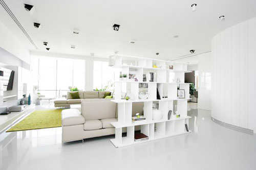 以简洁明亮的开放式空间为主,设计师以白色为底,良好的采光和光洁的自流平地面让视野十分的宽阔,草绿色和黑色的点缀让白色空间多了些特殊的色彩,流线型的墙壁增添柔软氛围,卧室也以简约现代为主。