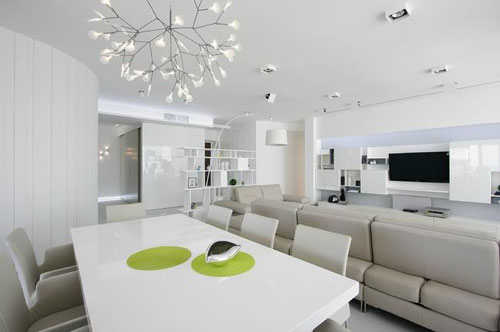 客厅选用白色沙发和桌椅等家具,洁净大方,造型也很时尚高雅,墙上的壁画艺术感很强,可以看出主人美和艺术的追求。