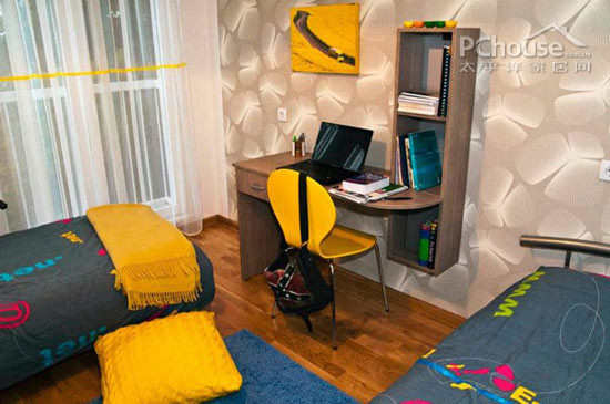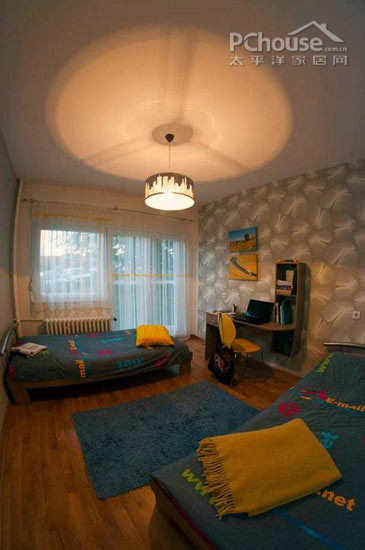 卧室大部分的装饰品都是Dragana纯手工原创出来的作品。至于不规则的蓝黄色的床品也是Dragana自己编织的,她还亲手缝纫了窗帘。