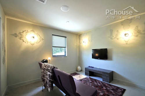 卧室旁有一个小巧的休闲区,壁灯加上墙纸,光效产生的美感不言而喻。音箱隐藏的恰到好处。