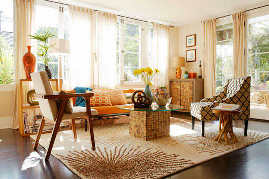 编辑点评:大面积的窗户使客厅光线充足,空间显得宽敞明亮。简约的地毯固定了客厅空间,其放射性图案在视觉上更有拓宽空间的独特效果。各种几何图案、墙角储物柜门与桌子支架的立体图案都让客厅变得更立体,更有空间感。柔和色调的客厅给人一种暖洋洋的感觉,温馨舒适,优雅怡人。