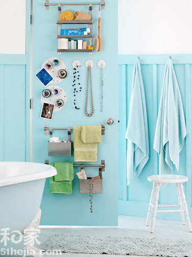 如今的很多家具都是可以自由搭配,不受空间限制,卫浴间也是如此。造型简洁的壁柜、小巧灵活的粘钩,还有可折叠的方和木质坐凳,不仅让杂物放置的更有条理,还可以更有效地利用空间,虽然视觉上可能有点凌乱,但乱中有序也正是收纳的宗旨所在。