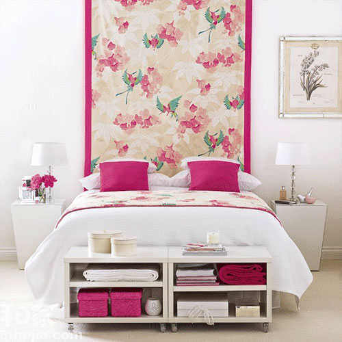 房间的布置最吸引眼球的是的花鸟图案的墙纸,桃红色的沟边更是特别。鲜嫩的桃色花朵点缀了整个房间。
