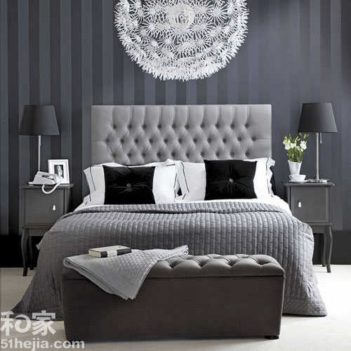 黑与白的搭配,是永恒的经典。单一的色彩并没有让人觉得单调,反而使房间具有层次感。松软的床头垫,是你闲暇之余读书的绝妙这所。床头柜上的白色小花,给房间注入了活力。