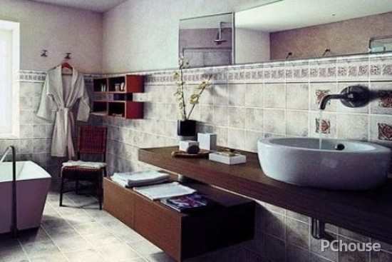 洗手间主人布置得也非常精致。仿古砖给墙壁带来了复古感。洗手盆周围的暗色大理石加重这种复古感。