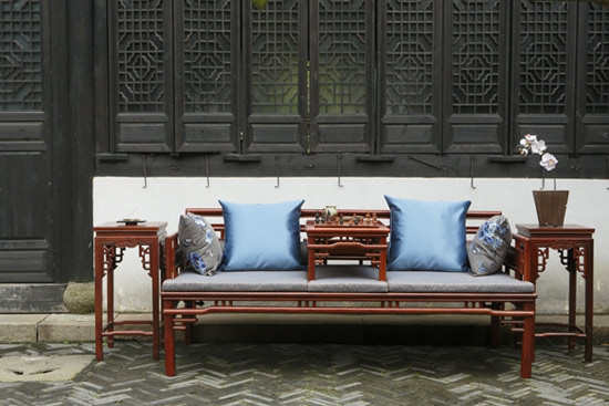编辑点评:经典的古代长椅款式,混搭以西方方形抱枕,两者衔接自如,毫无违和感。