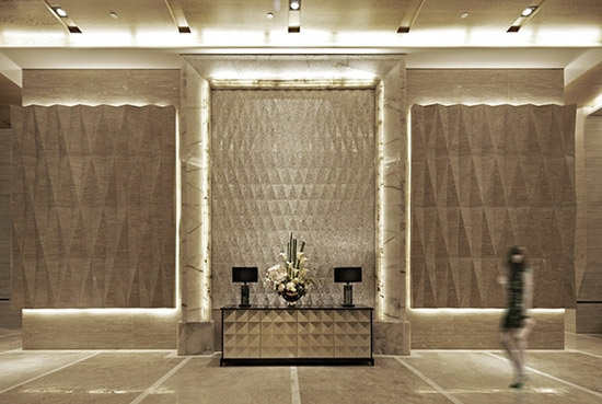 编辑点评:背景墙以多面体三棱设计,特别是前台后的水晶棱镜设计,设计师深懂其肌理并以最精湛的工艺表现其华贵。