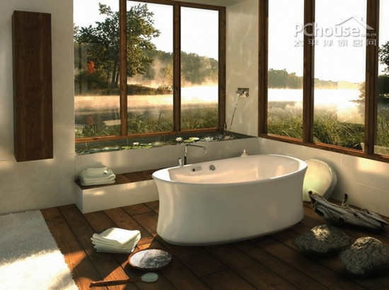 编辑点评:飘窗式的浴池设计节省了浴室空间,满足了视野需求,如置身大自然般,贴心的楼梯设置更是美好。
