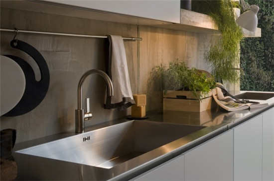 空间太小最怕东西多,把台面收拾干净,即使是小户型的厨房,也有了宽敞的效果。所以,收纳很重要,实木橱柜是个明智的选择,锅碗瓢盆全部都可以完美地藏身。
