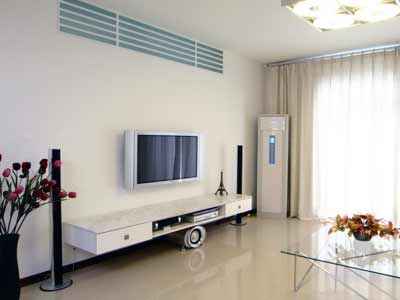 与上幅中的电视墙一样,简单无装饰,但是效果却要出色很多,没有真正的电视墙概念,用音箱与电视长柜勾出电视墙的概念,干净柔和,与整体的房间效果非常的协调。