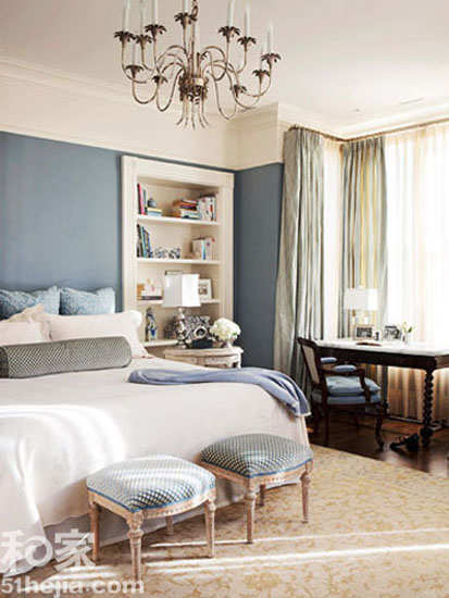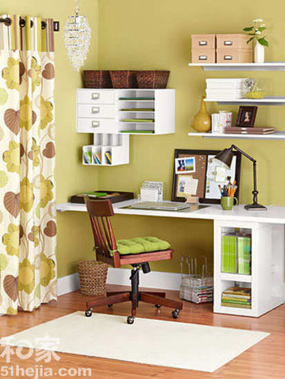 如果没有必要的室内光线设置,电脑屏幕的投射出的光线最容易使得眼睛疲劳。除了室内吊灯,如果选择一个台灯,记住用冷色调柔和的灯光可以帮助阅读,创造出一个不易分心宁静的家庭小书房或者办公室。