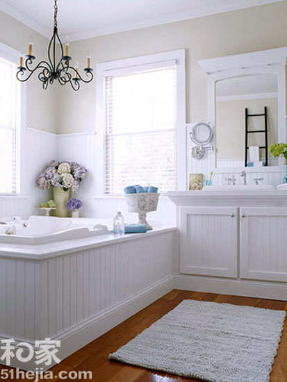 镜前灯足够保证了日常梳洗的照明,适当的照明高度报以最眩目的灯光和最少的阴影。除了台盆所在空间灯光设计外,另外一个空间照明更是不容忽视,一盏温暖的台灯或者是一盏浪漫的吊灯,更多的时候是在浴缸周围营造一个关于放松家居氛围。