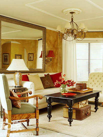 创造温暖的客厅,精心策划和摆放的灯具来讲更容易些,因为灯光更能营造出某一种特定的氛围。这一客厅中央欧式宫廷戏吊灯是重头戏,迎合整个室内风格。墙上红色的壁灯高度刚好能跟人的视线高低一致,鲜艳的色调也更能吸引眼球,丰富了室内色彩,同时台灯灯座上精心雕刻的花纹为空间注入了其他的生命力。