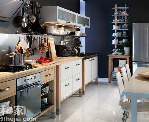 如果厨房不是很宽,但又有很多空白墙面没被利用,可以利用小搁架和独立挂钩来增加储物空间。搁架一定要选择那种宽条形的,以免占用过多空间。这样巧妙地利用空间,既不影响小厨房的使用,还增加了空间利用率。