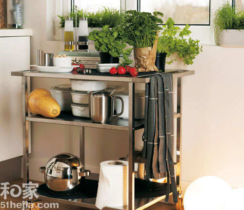 可移动的备餐车在烹饪时推到料理台边,能提供宝贵的使用空间;其他时间则靠墙放置,让小户型厨房显得更加利落。