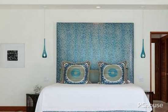 卧室装修在颜色上以蓝色和白色为主,这样显得非常的清爽大方。整个卧室没有加入华丽的装饰,也没有再加入多余的亮色点缀,简单精致的吊灯,让整个卧室又呈现出一种古典的感觉。