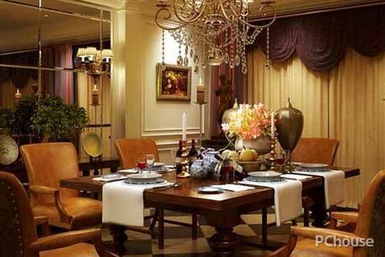 实木的餐桌设计搭配皮质的座椅,显得非常的大气。整个餐厅的装修没有采用过于华丽的装饰,搭配精致水晶吊灯,既大方又温馨。