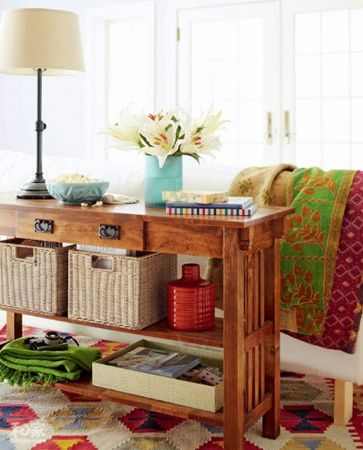 为了增加收纳空间,可以为储物架增加一个层板,令它更加实用。这个小小的创意可以让它变成一个实用的沙发边几,涂上一层木器漆让木质看起来华贵沉稳。铁艺抽屉拉手和桌面下四角建筑感的配件装饰带来复古感觉。