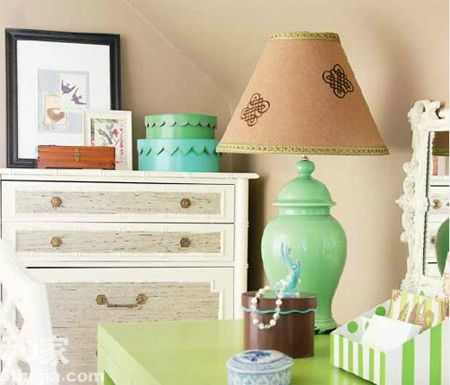 蘑菇图案将四屉柜装饰一新。先给旧柜子刷成银白色的乳胶漆打底,待干后用胶纸剪成大小不同的蘑菇图案,然后把这些图形贴到柜子上,喷上亮绿色的木器漆,等油漆晾干后将蘑菇纸模揭掉即可。