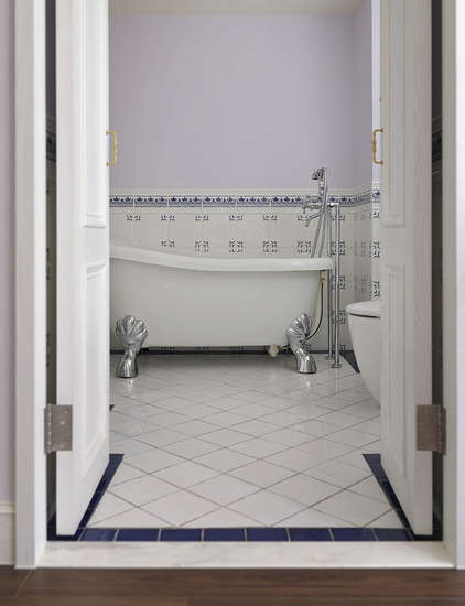编辑点评:特别挑选的砖面与浴缸,打造优雅的泡澡时光,方砖铺陈最为最基本的空间分割。