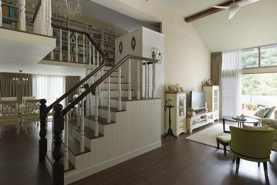 编辑点评:位于全屋中央的楼梯,张馨设计师以实木染色的技法,呈现原汁原味的美式乡村风。