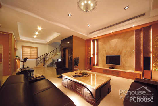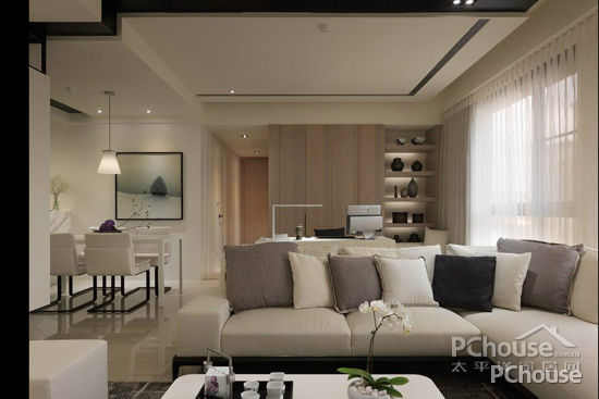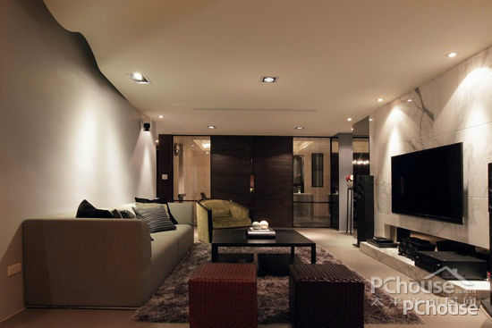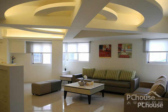 客厅天花设计以弧线收边处理,间接光源作沟缝变化沿着天花造型规划,以弧线作为时尚语汇的表情主题。
