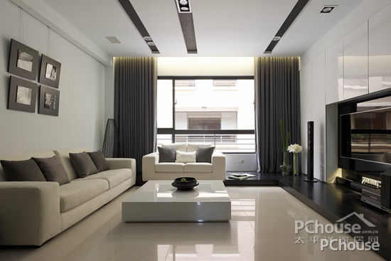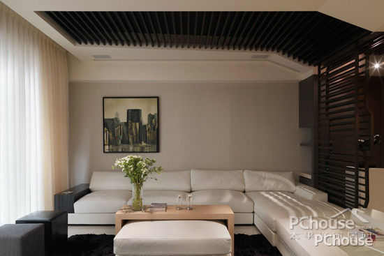 设计师采用条纹状的天花板造型,让空间具有延伸感。以黑、白二色为整体空间的主轴,并以宽敞明亮为考量,在大面窗景的帮衬下,阳光洒落室内滋润洁白的基底,呈现出屋主想要干净舒爽的感觉。
