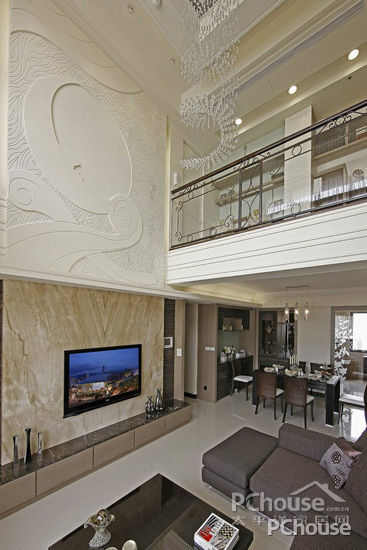 客厅中的大型吊灯灯饰,以晶莹通透的水晶折射的视觉效果展现流瀑般的光采,与壁式的日月语汇做应对。