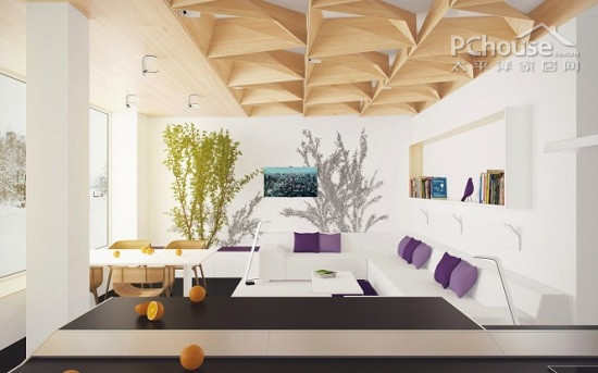 编辑点评:客厅中,同样是自然与现代的结合装饰风格。木质的墙面、绿色的盆栽,为空间营造出清新自然的意境。棱角分明的现代家具,黑、白、深紫色的色调搭配,则是彰显空间的时代感与现代感。