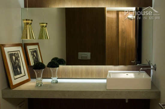 编辑点评:纯白色的浴缸,两个对称的大镜子,以及棕色的光滑地板设计,遵循了公寓的整体风格!