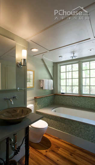 编辑点评:浴缸附近区域铺上绿色马赛克,美观又实用。实木地板没抛光砖光滑,防滑较好。台盆区域下部分中空,让其看上去占用的位置不大。
