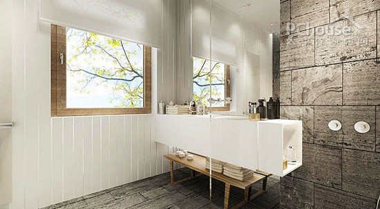 编辑点评:色调一致的灰白色,搭配部分棕色,浴室的风格同样简约而霸气外露。个性化的座椅让浴室增色不少!
