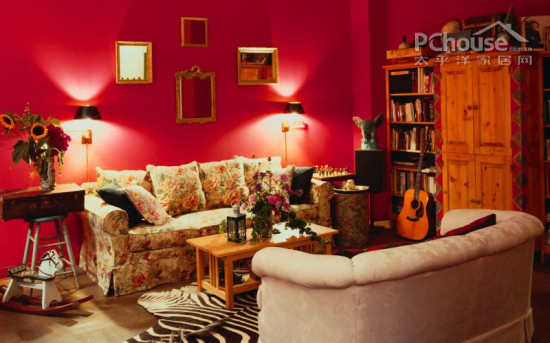 编辑点评:沙发的暗红色,天花板的亮红色,以及墙壁上的红色装饰框,三者形成一个整体,又各不相同,性感中透露着小女生的可爱!