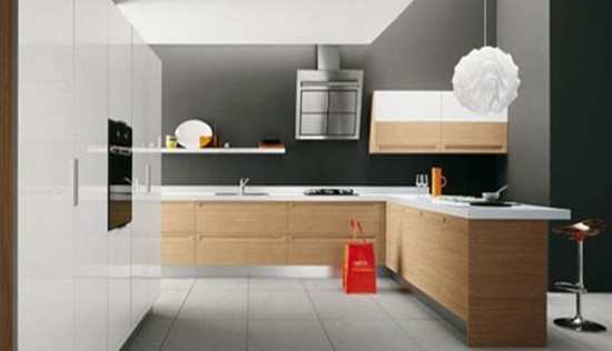 原木的实木橱柜给人清新淡雅的感觉,搭配白色跟浅灰色多了一份简约的时尚感。橱柜也擦用了很多内嵌式的收纳设置,节省了不少空间。