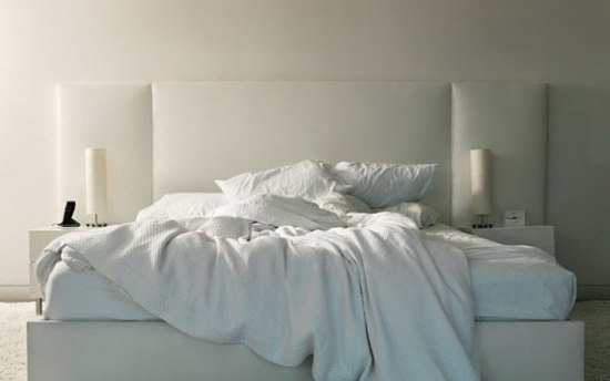 板正的床头和床体设计与上面放置的杂乱床垫以及床上用品形成了鲜明的对比,特别是在整个空间中就剩下白色的时候,克制和诱惑就这样在卧室中上演着一场大战。