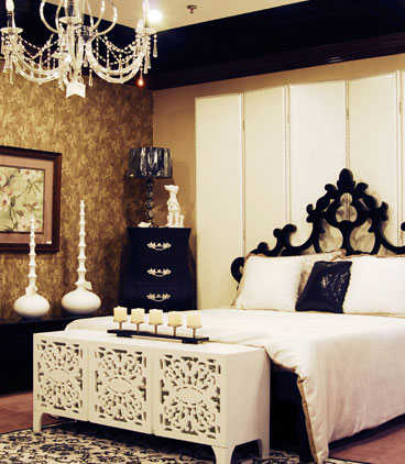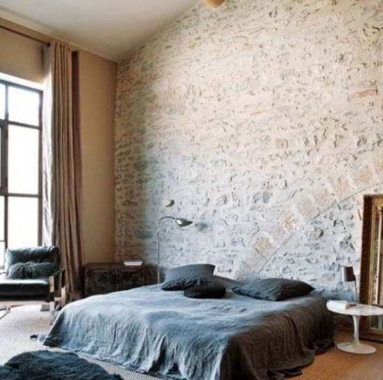 在特定的情况下黑色也可充满诱惑,毛茸茸的黑色地毯,舒适的黑色床品搭配上充满原始味道的墙面以及全麻质的地毯,张扬的个性空间中也不乏自然、质朴感。