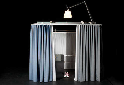 由antonio scarponi与视觉艺术家roberto deluca为瑞士公司daskonzept设计的‘hotello’, 4平米单元是一个临时居住单元,让使用者可以立即入住任何一栋空置建筑。所有的东西都打包在一个箱子中,这个便携式空间包含了所有工作和生活必需品。它由金属框架支撑,还装有半透明的吸音窗帘。这个模数化空间还可以相互组合,创造出不同的空间布局。