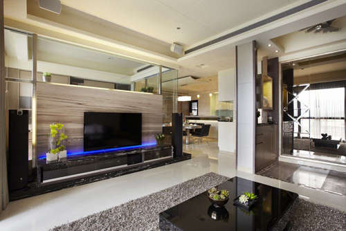 编辑点评:电视墙下方安装带状的LED情境灯光,七彩转换的光影,丰富居家空间的主题。