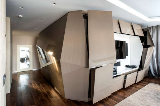 编辑点评:立体感的电视墙内部是充裕的收纳空间,柜门采用自动开关,因而柜面干净无棱角,使收纳完美地隐藏于背景墙中。