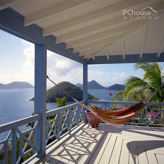 编辑点评:海景阳台有天然优越的景观地势,白色木质搭顶搭配木质地板,一个吊床式的摇篮就能给你一个自然的好梦。