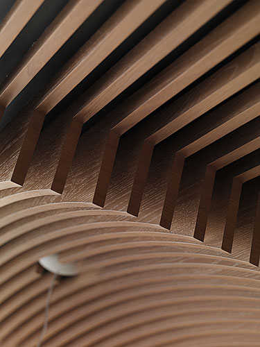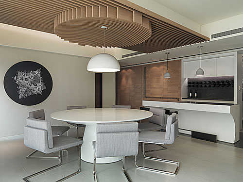 编辑点评:设计师以直线木条铺陈整个餐厅上方的横梁,并在餐桌上方拉出圆型天花,呼应中式圆型餐桌。