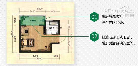 1、阳台希望改成封闭式阳台,厨房和洗衣机布局在阳台上。