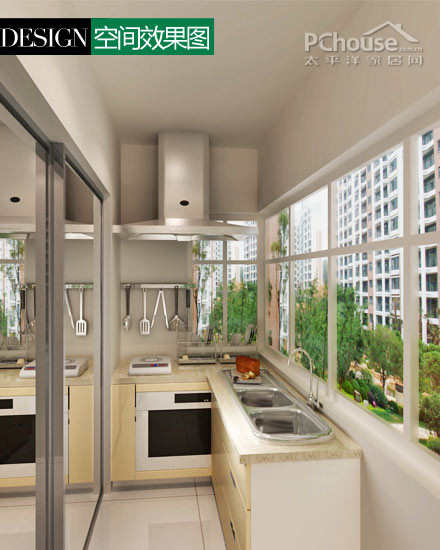 1、将厨房与生活阳台功能结合,采用一样的柜体材质,可达到视觉统一。