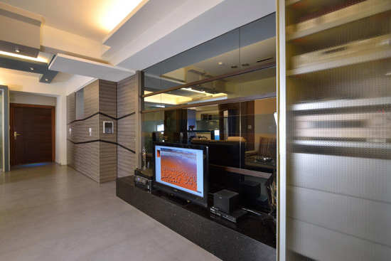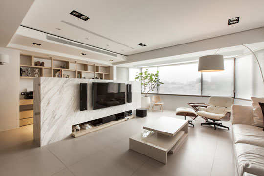 编辑点评:悬挂的电视机设计节省空间,与之相互呼应的是低矮的茶几,一高一低,增加空间的层次感和立体感。大理石电视背景墙分割空间又保持空间的完整性,墙底的挖空设计,增加了了空间的收纳功能。