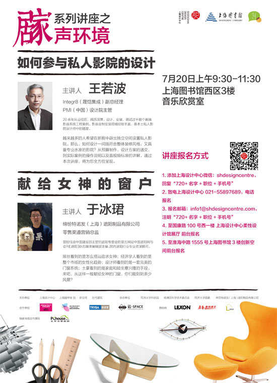 【太平洋家居网 设计频道】由上海设计中心和上海图书馆创新空间联合主办,太平洋家居网独家全程报道的——居家系列讲座,将于7月20日在上海图书馆西区3楼音乐欣赏室开讲新一期——《居家系列讲座之声环境》,我们将邀请integr8(晟恺集成)副总经理及PMI(中国)设计院主管王若波演讲关于如何参与私人影院的设计、缔纷特诺发(上海)遮阳制品有限公司零售渠道营销总监于冰珺为大家带来窗户设计的主题,欢迎广大室内设计师、网友、市民和行业内人士来聆听。